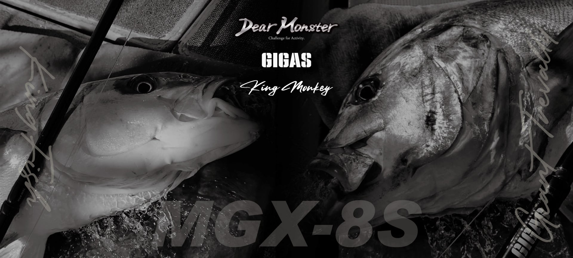 Length:7’10”ft/8’3”ft(替え穂付属) Power:エクストラへビー Action:レギュラーファースト Lure capa:~200g Line capa:~PE8号 Leader capa:~200lb 自重:430/435g 継数:6 仕舞寸法:50cm トップガイド:リングサイズ 16 リールフット以下:50cm Dear Monster MGXシリーズ 第2弾となるMGX-8S“King Monkey”。 MGX-∞S“G.T.Gorilla”とグリップおよびブランクスのレングスバランスは意図的に揃え、ブランクス素材だけを高弾性化。 “ハリ”を持たせた設計は、現代のシーンを鑑み、より軽量・小型ルアー(70~100g)の操作性、およびその飛距離向上を意図している。 結果、そのサブネームが暗示するようにヒラマサ(King Fish)ゲームへの適応性が高まった。 高弾性ブランクスは、使い手の入力するパワーをレスポンス良くキャストやルアーアクション、リフトアップパワーに変換し、スピード感あるフィッシングスタイルを実現する。 遠征釣行が常のビッグゲームだからこそ、モバイルロッドの真価が発揮される。MGX-8Sは“替え穂”を活用することで幅広いルアーウェイトに対応することはもちろん、水絡みに気を遣うようなルアーのアクションコントロールも容易に。“モバイルロッドだからこそできること”を、改めて世に問う1本に仕上がった。